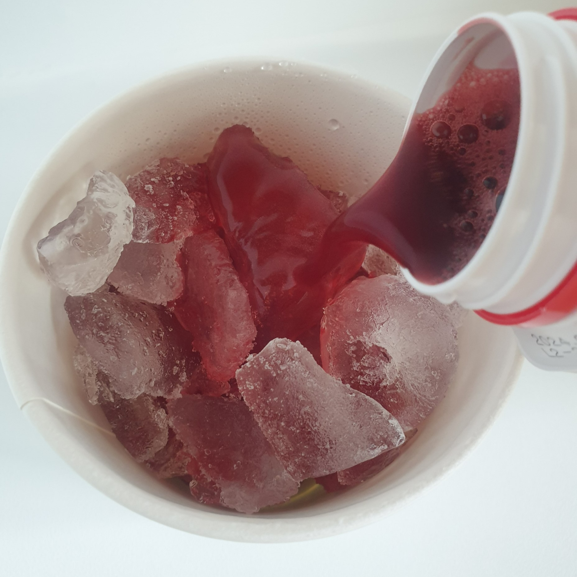 집에 있는 하루야채 음료를 얼음에 부어서 마셨다.