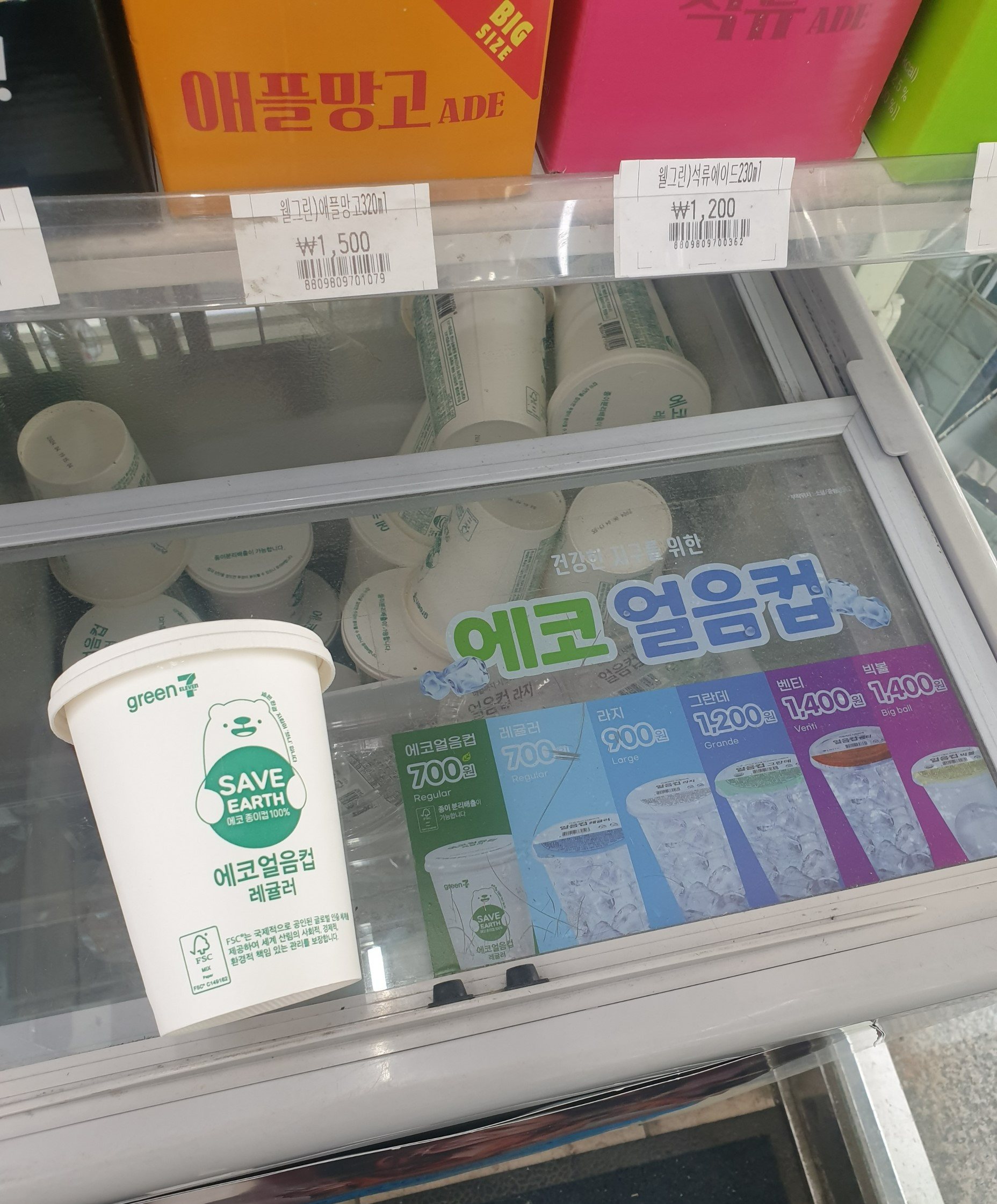 내가 방문한 편의점은 레귤러 에코 얼음컵과 라지 사이즈 플라스틱 컵 얼음만 있어서 에코 얼음컵을 선택했다.