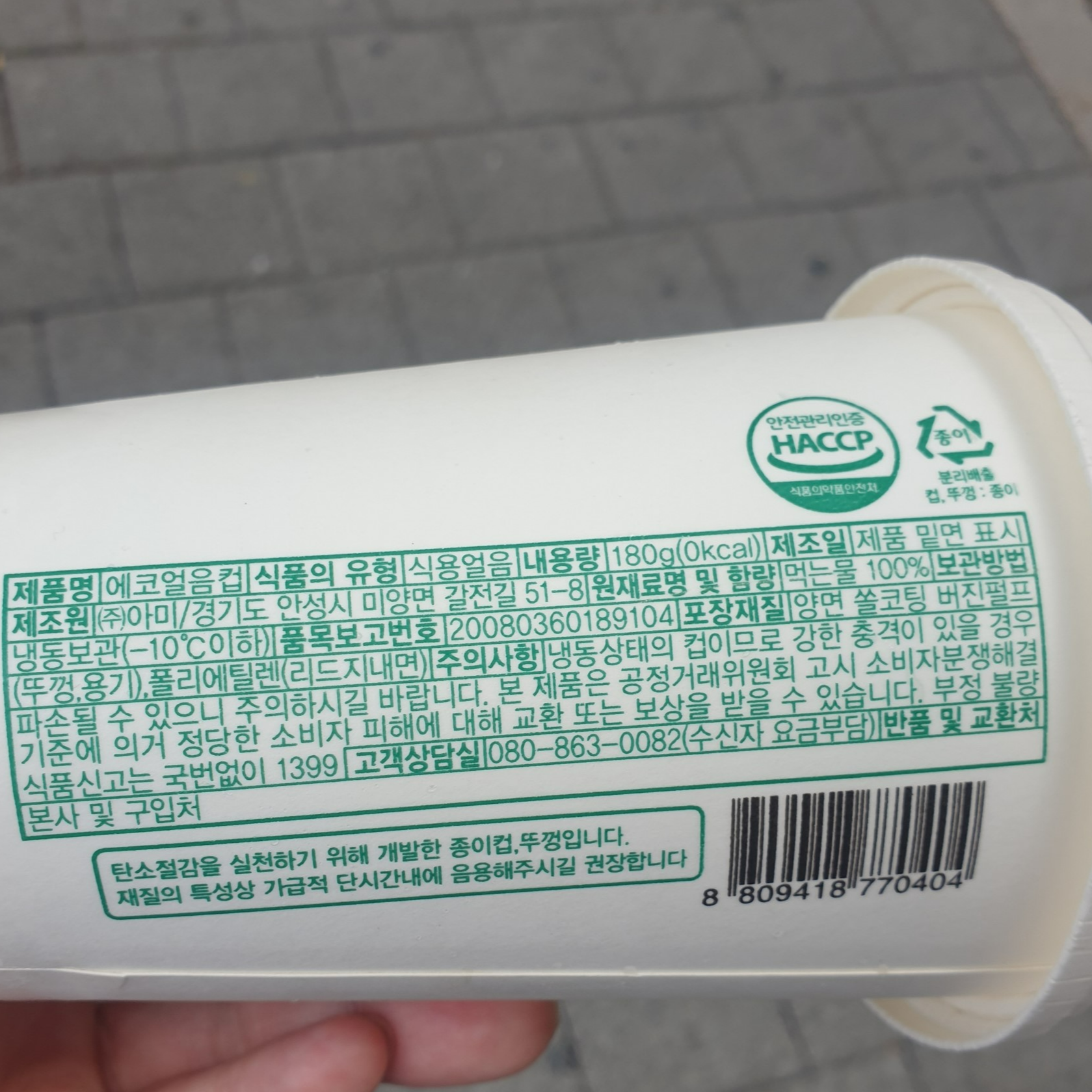 제품명은 에코 얼음컵으로 식용얼음 180g이 들어있고 (주)아미에서 제조한 상품이다.