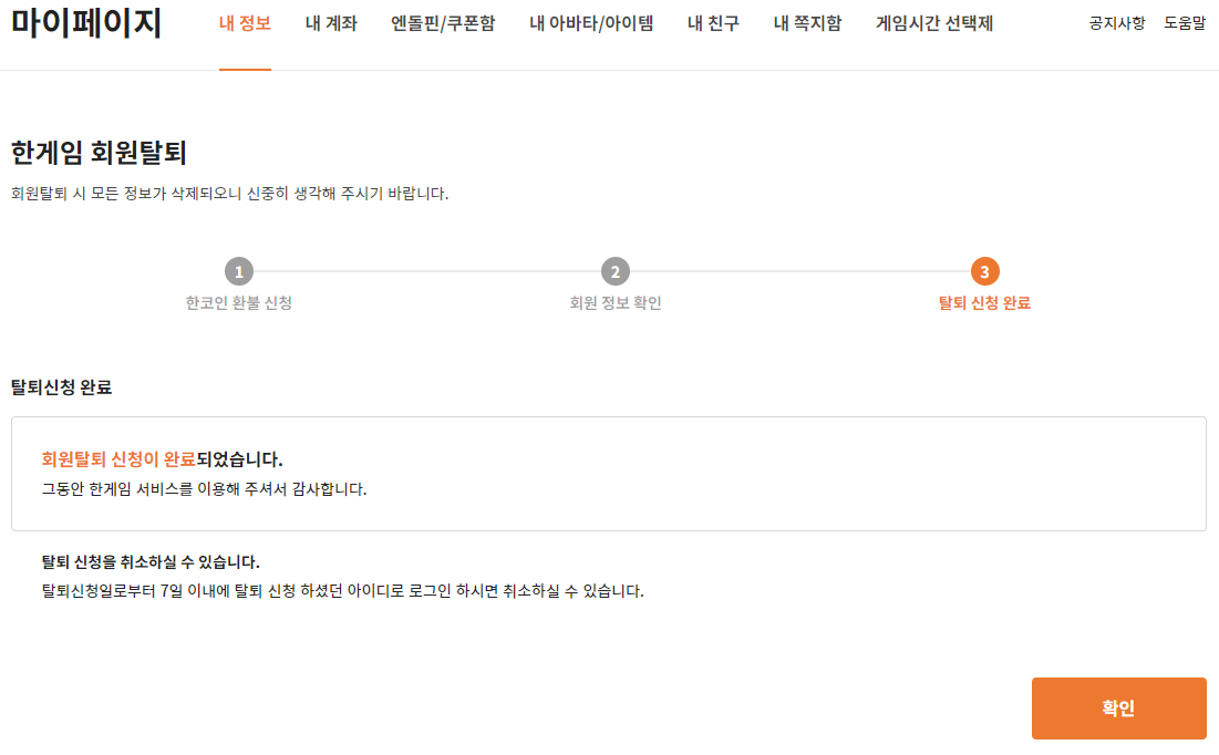 한게임 탈퇴는 마이페이지-내정보-한게임 회원탈퇴에서 할 수 있고 7일 이내에 로그인을 하면 취소된다.