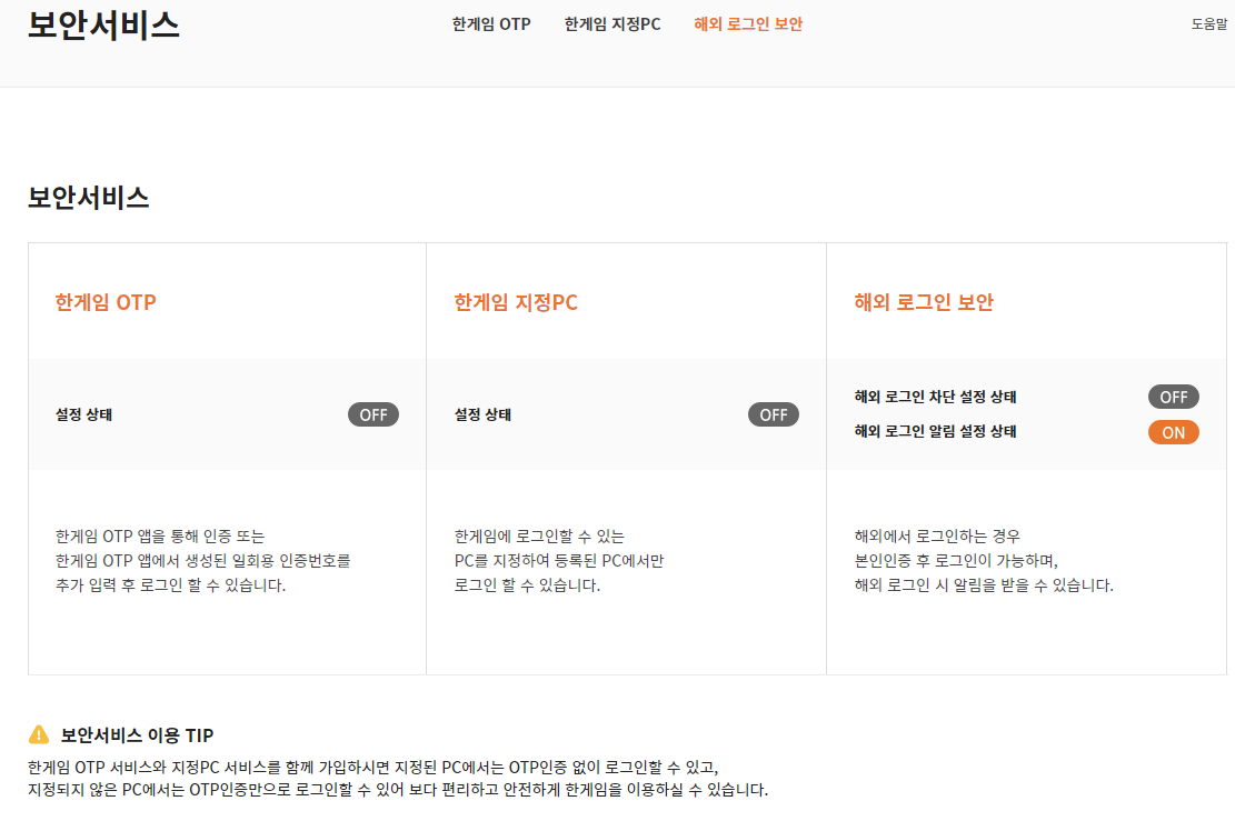 한게임 보안서비스를 보면 해외로그인 보안에서 해외 로그인 차단과 알림 여부를 선택할 수 있다.