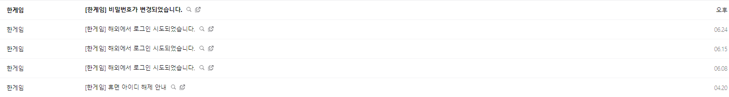 이메일을 확인하는데 몇 주 연속으로 한게임에서 해외에서 로그인이 시도되었다는 메일이 왔다.