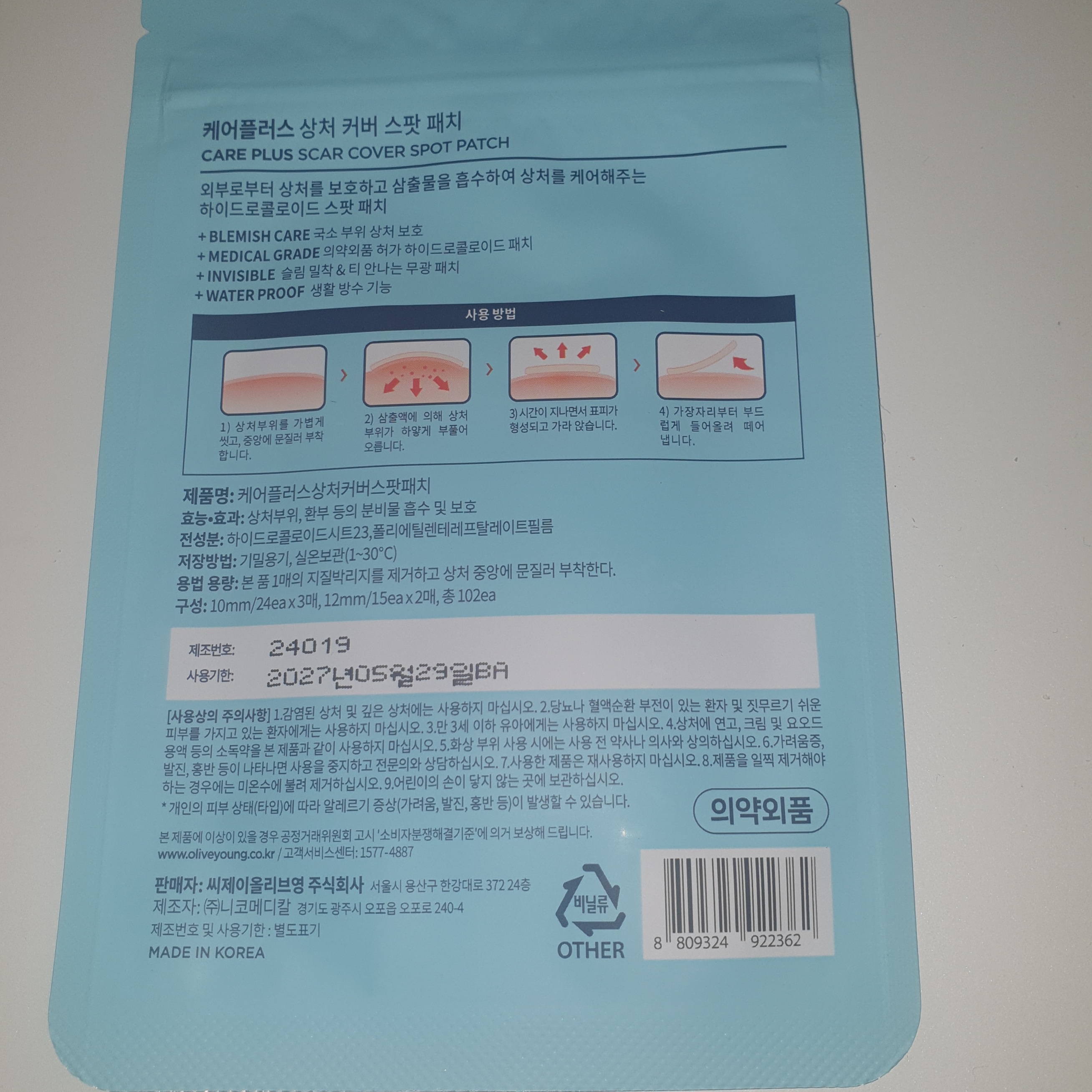 올리브영 케어플러스 상처 커버 스팟 패치는 짜고 난 후 붙여서 진물이 흡수되면서 상처 보호가 되는 스팟패치다. 짜기 전에 사용하는 패치는 따로 있는데 써본 적은 없다.