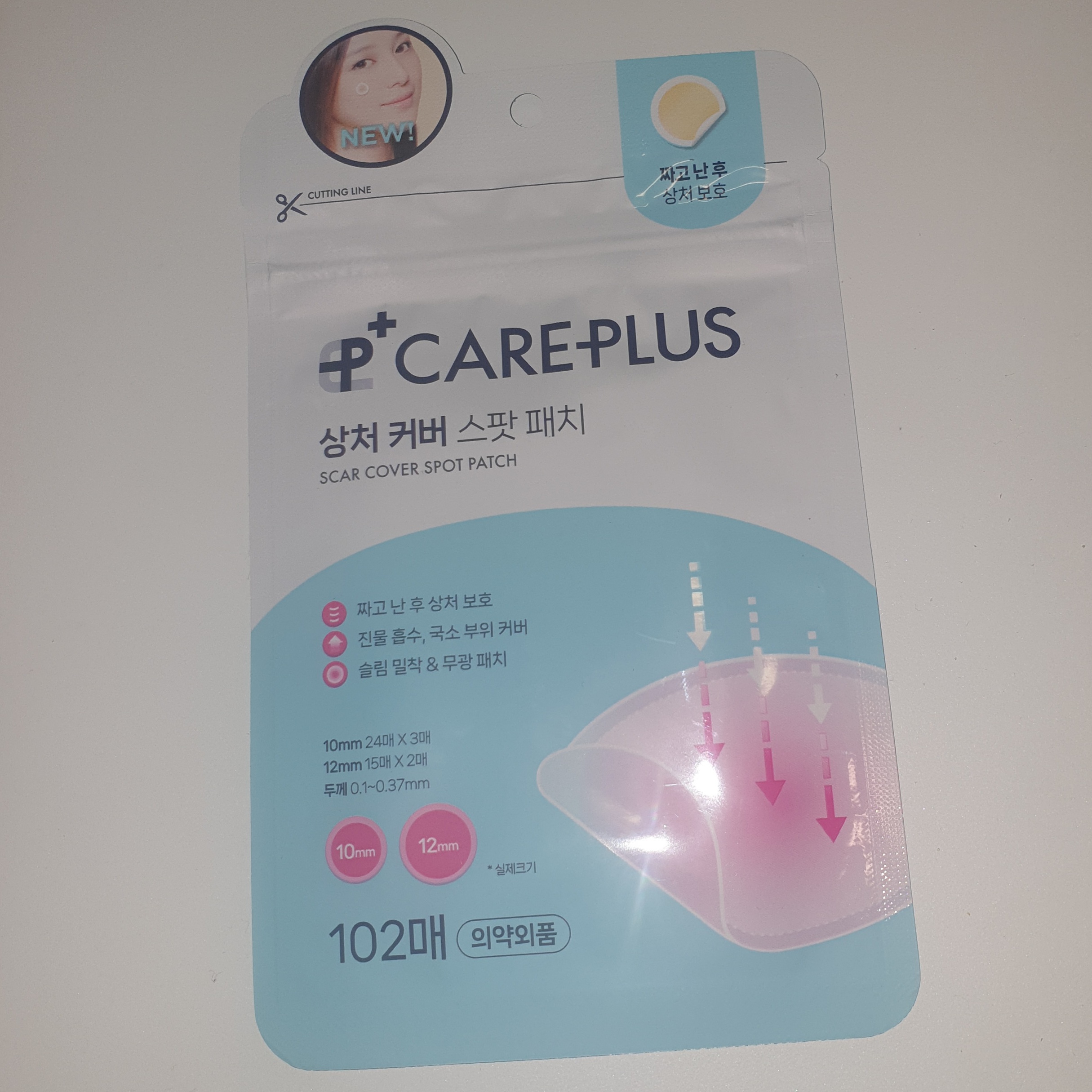 케어플러스 여드름 패치는 의약외품이고 10mm 72매, 12mm 30매로 구성되어 있고 두께는 0.1~0.37mm이다. 포장지에 실제 크기가 그려져 있는 게 유용한 것 같다. 하지만 아주 큰 상처나 여드름이 나는 일은 드물어서 10mm 크기도 충분했다.