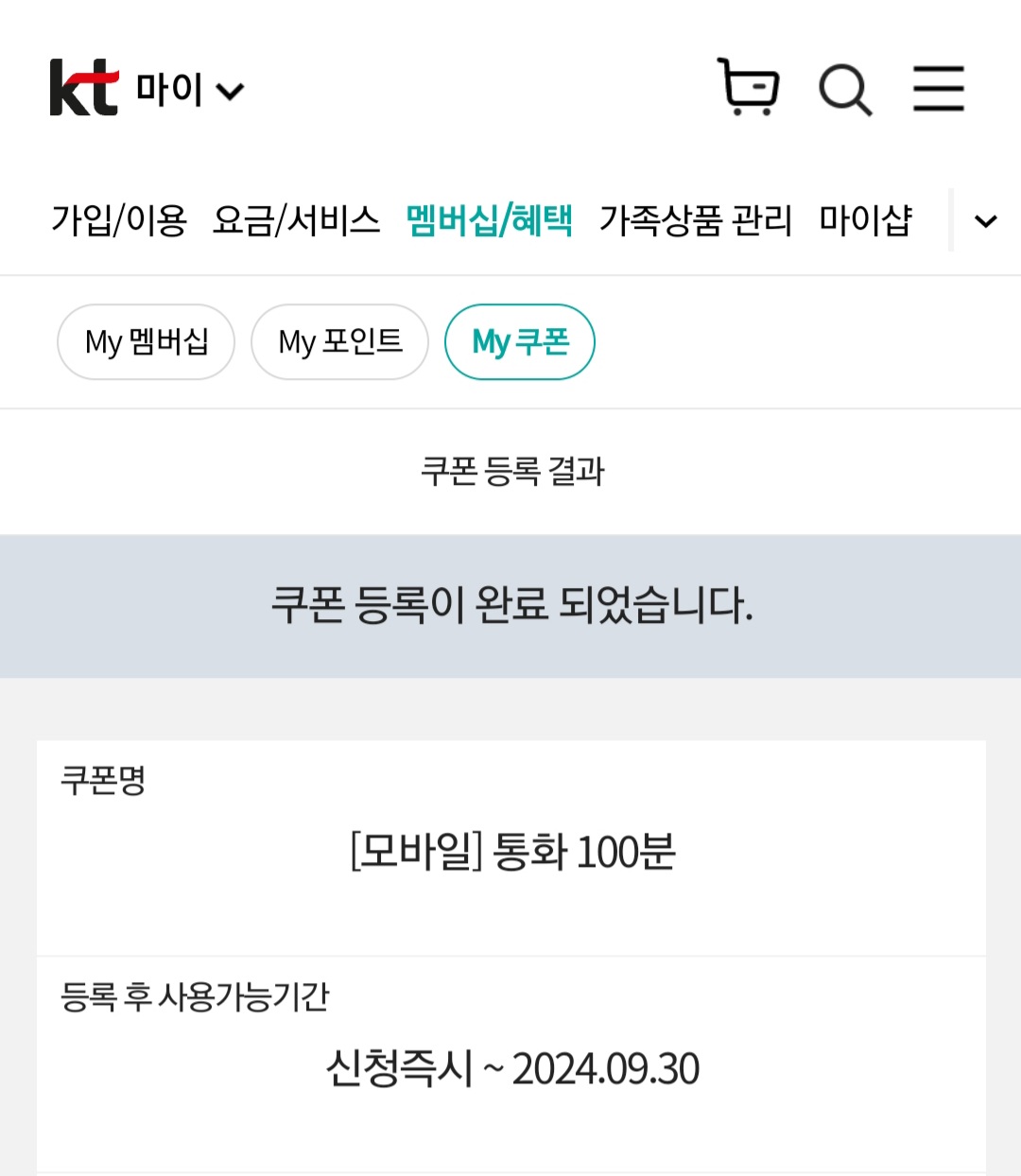 KT 장기고객 쿠폰을 등록하면 신청즉시부터 다음달 말 일까지 사용할 수 있다.