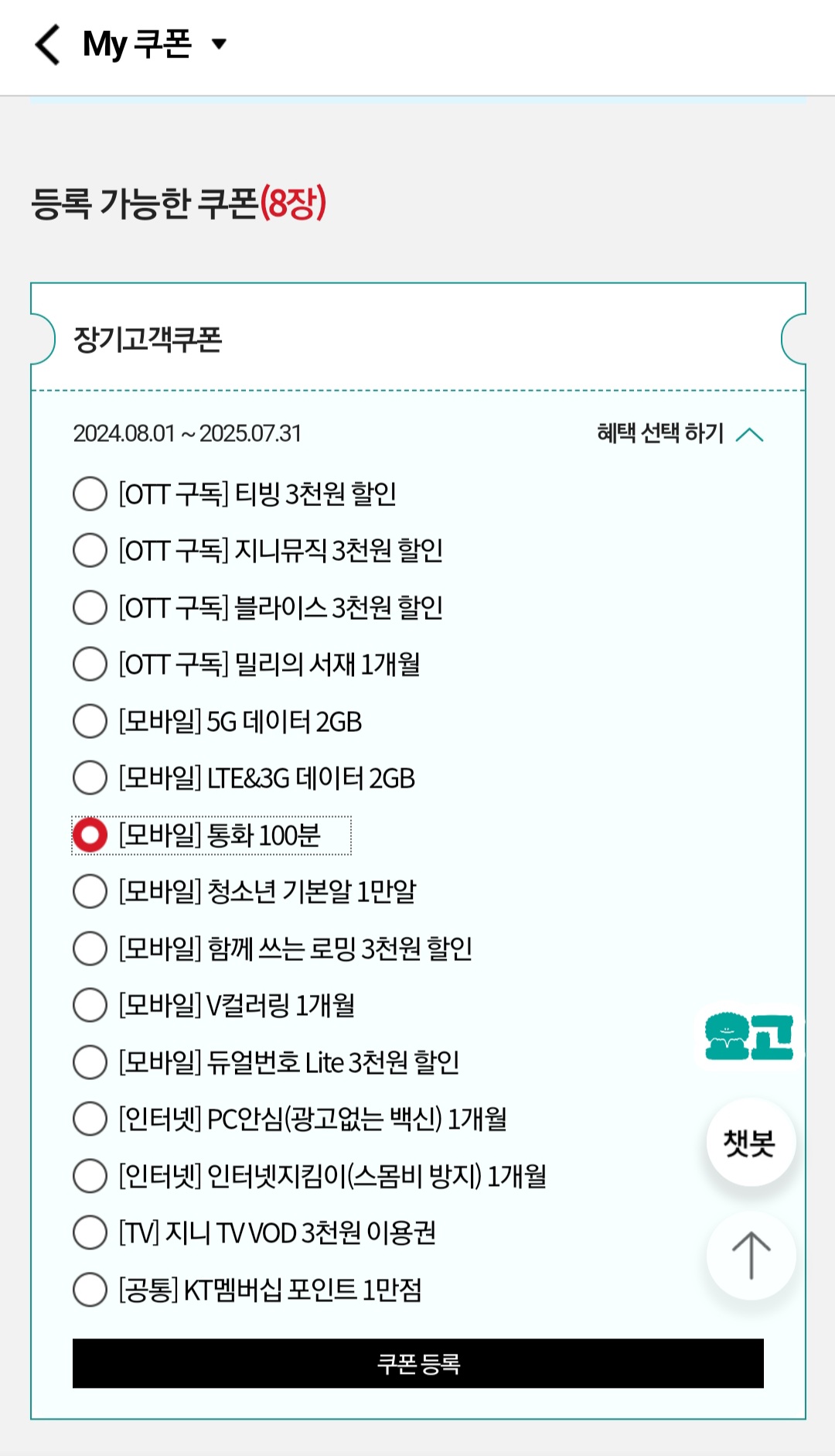 장기고객쿠폰은 OTT 구독, 모바일, 인터넷, TV, 공통 카테고리의 15가지 옵션이 있다.