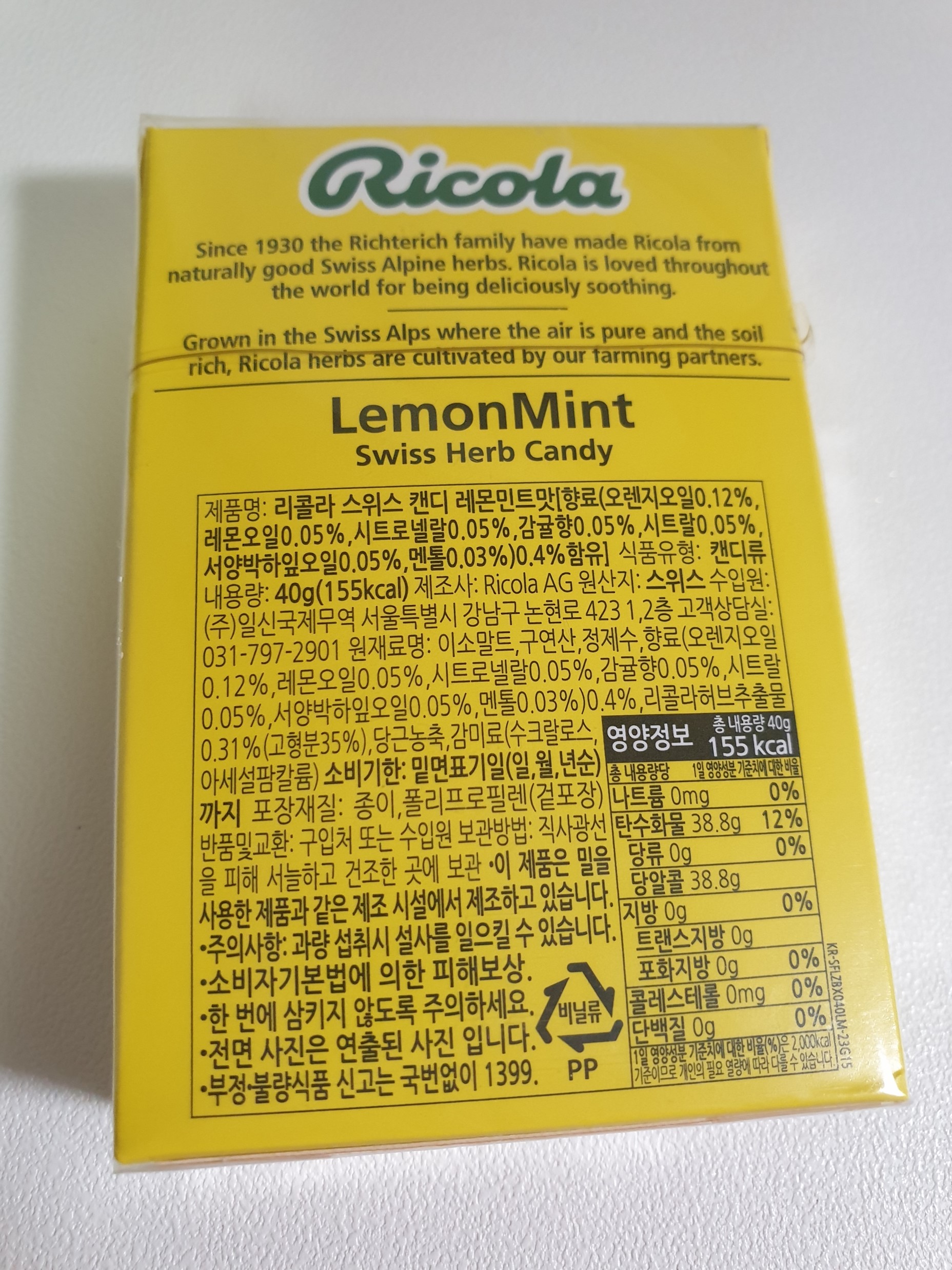 리콜라 레몬민트 칼로리는 40g에 155kcal이다.