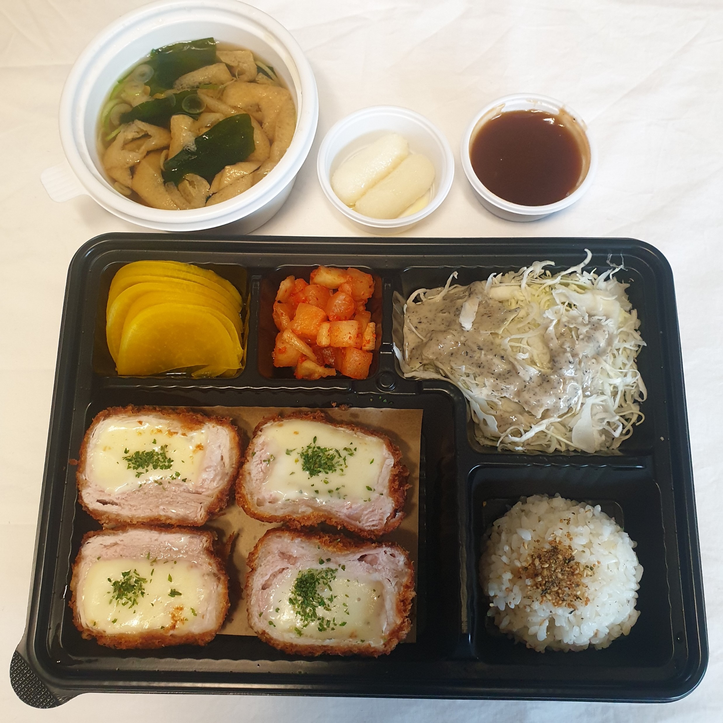 백소정 치즈카츠 포장 구성은 치즈돈까스 4조각과 소스, 단무지, 깍두기, 샐러드, 후리가케밥, 우동, 연유치즈떡으로 구성되어 있다.