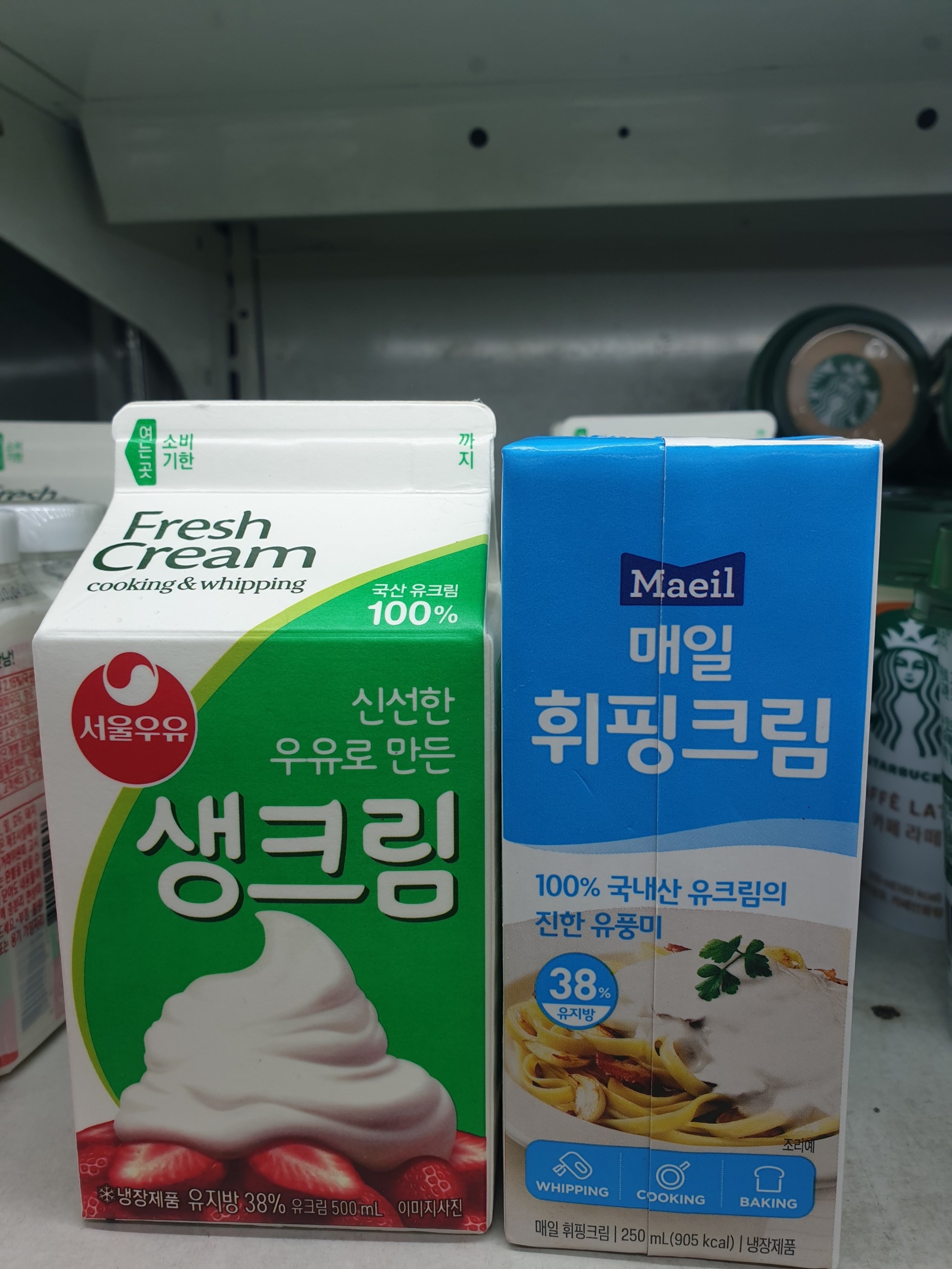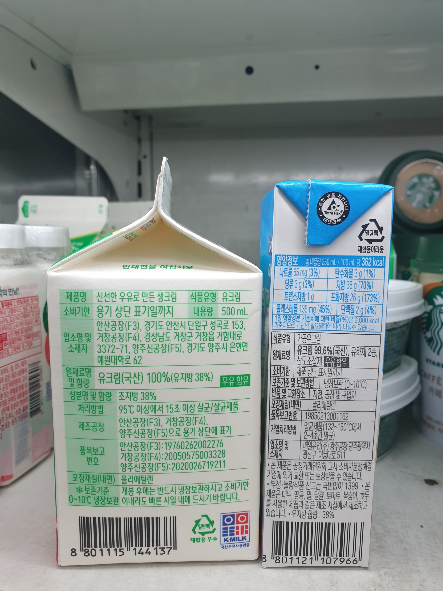 둘다 우유로 만든 냉장제품이고 유지방 함량은 38%이다.