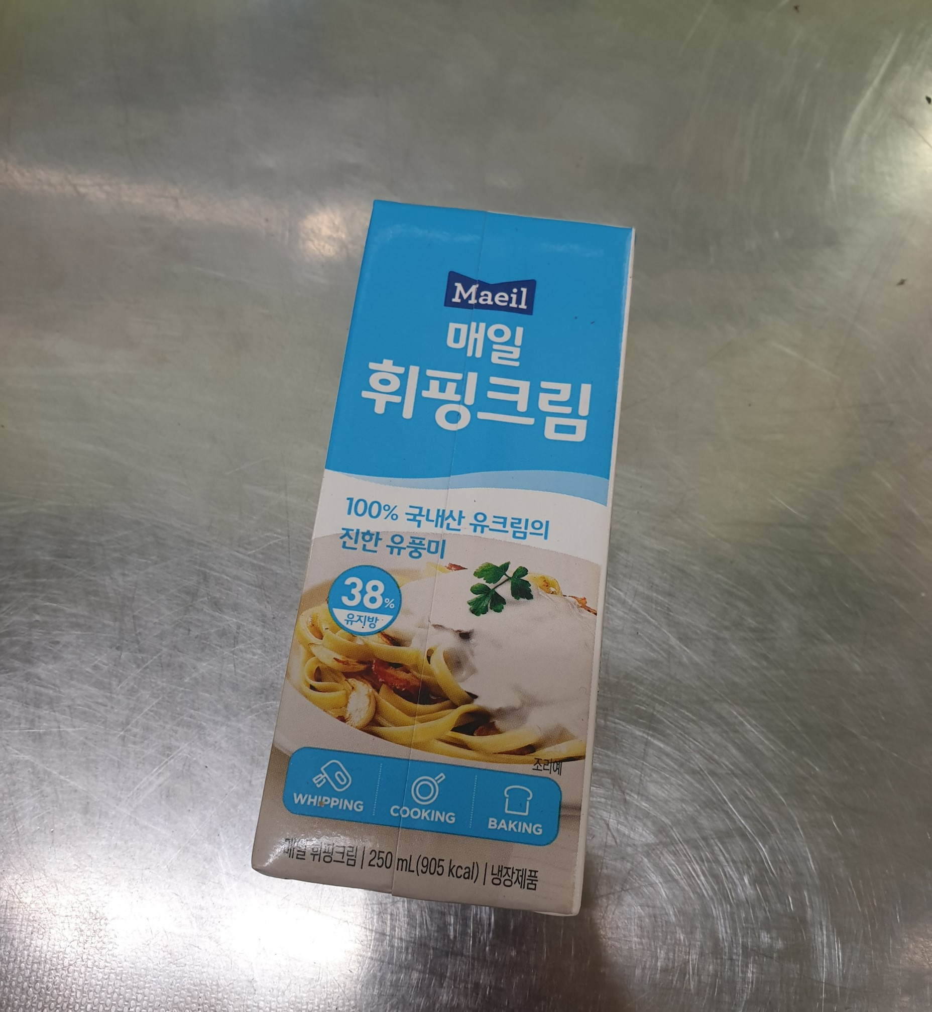 나는 크림파스타를 만들기 위해 생크림을 사려고 했는데 200ml 생크림은 품절이었고 500ml 생크림은 양이 많았다. 그래서 매일 휘핑크림을 구매했고 가격은 4,500원이었다. 크림파스타에 휘핑크림을 넣어도 되는지 궁금했는데 매일 휘핑크림 앞면에는 생크림 케이크가 그려져 있고 뒷면에는 크림파스타가 그려져 있다.