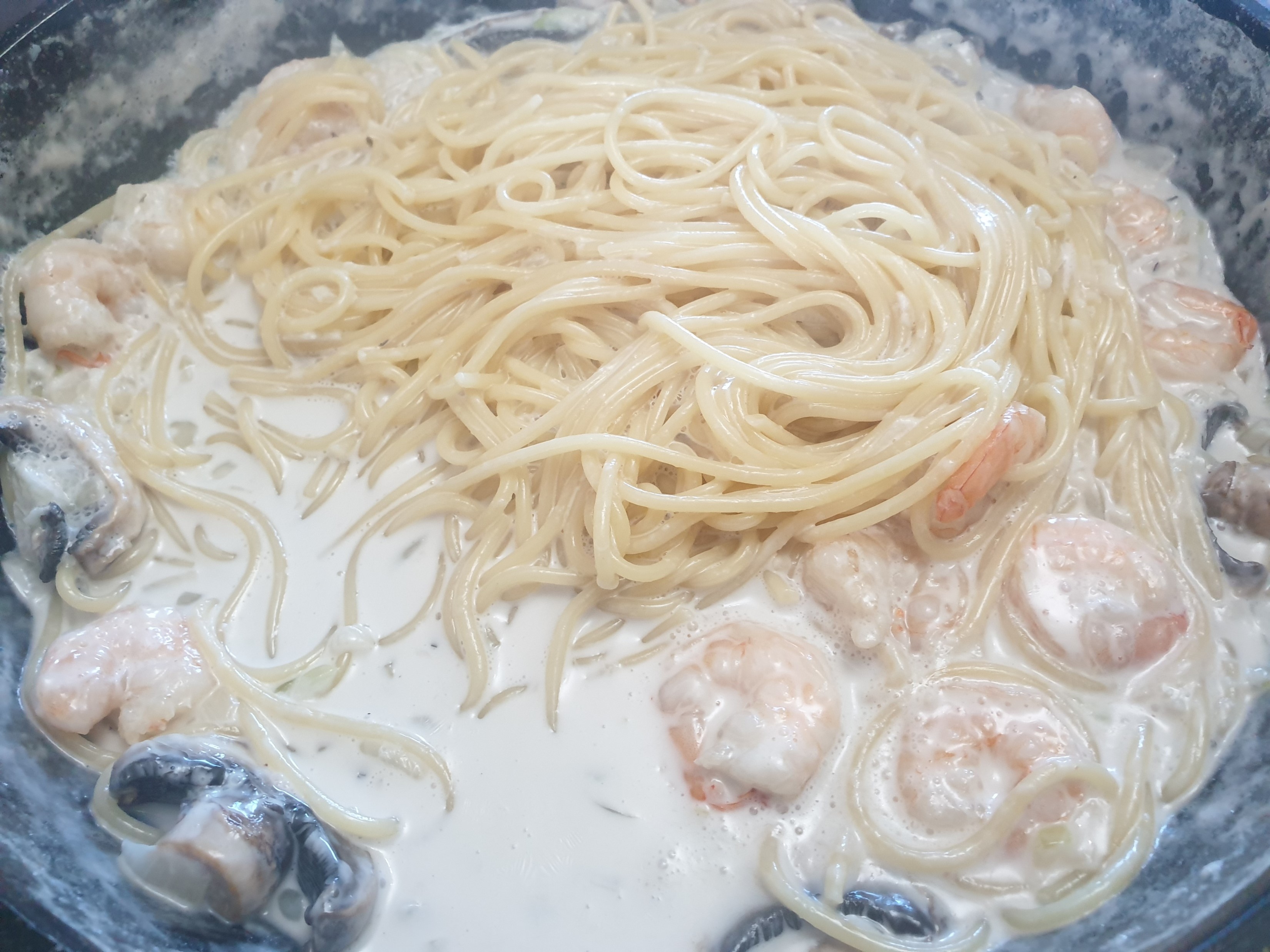 휘핑크림, 우유, 새우, 버섯, 스파게티 면만 있으면 집에서도 맛있는 크림 파스타를 만들 수 있다.