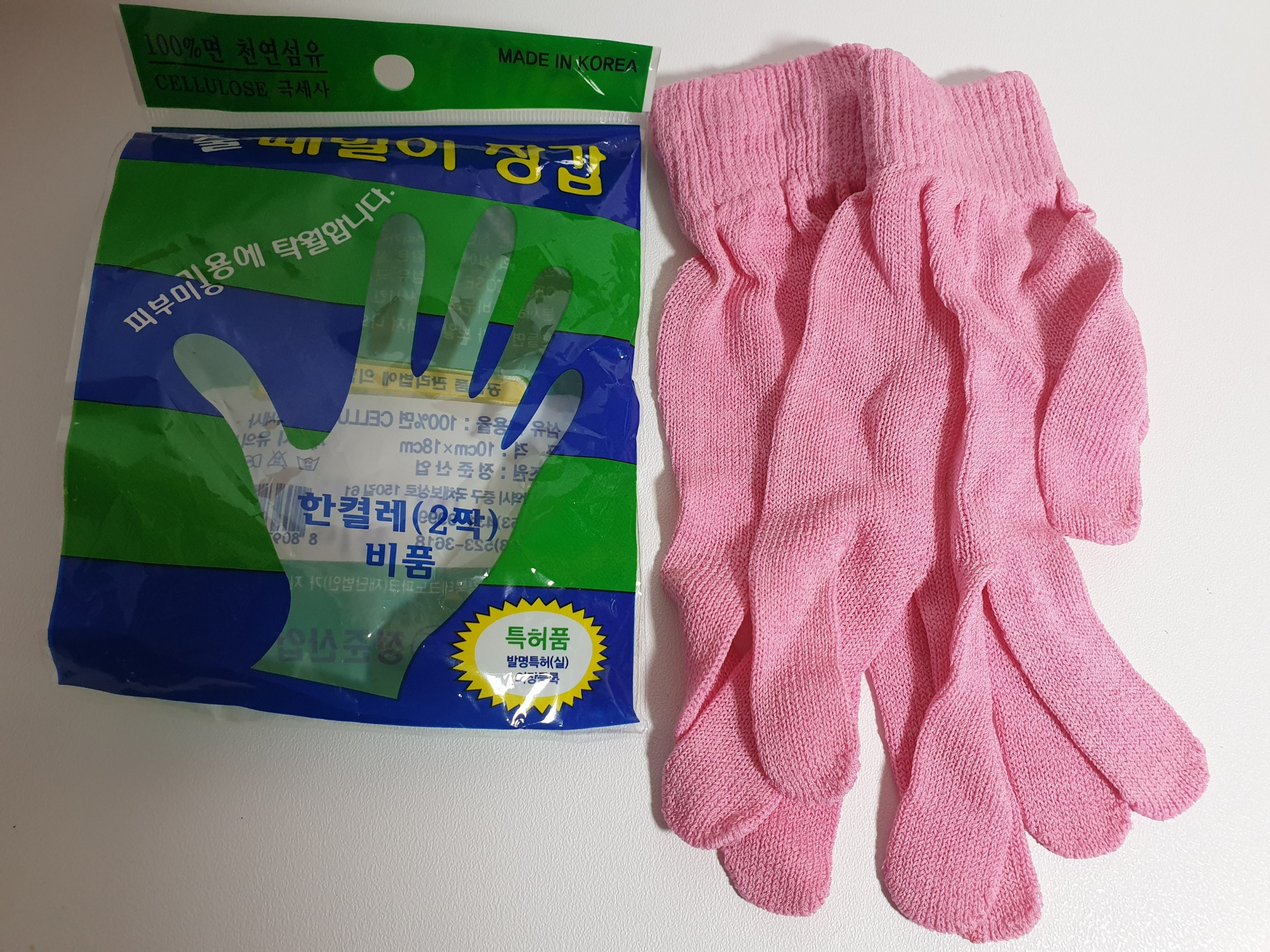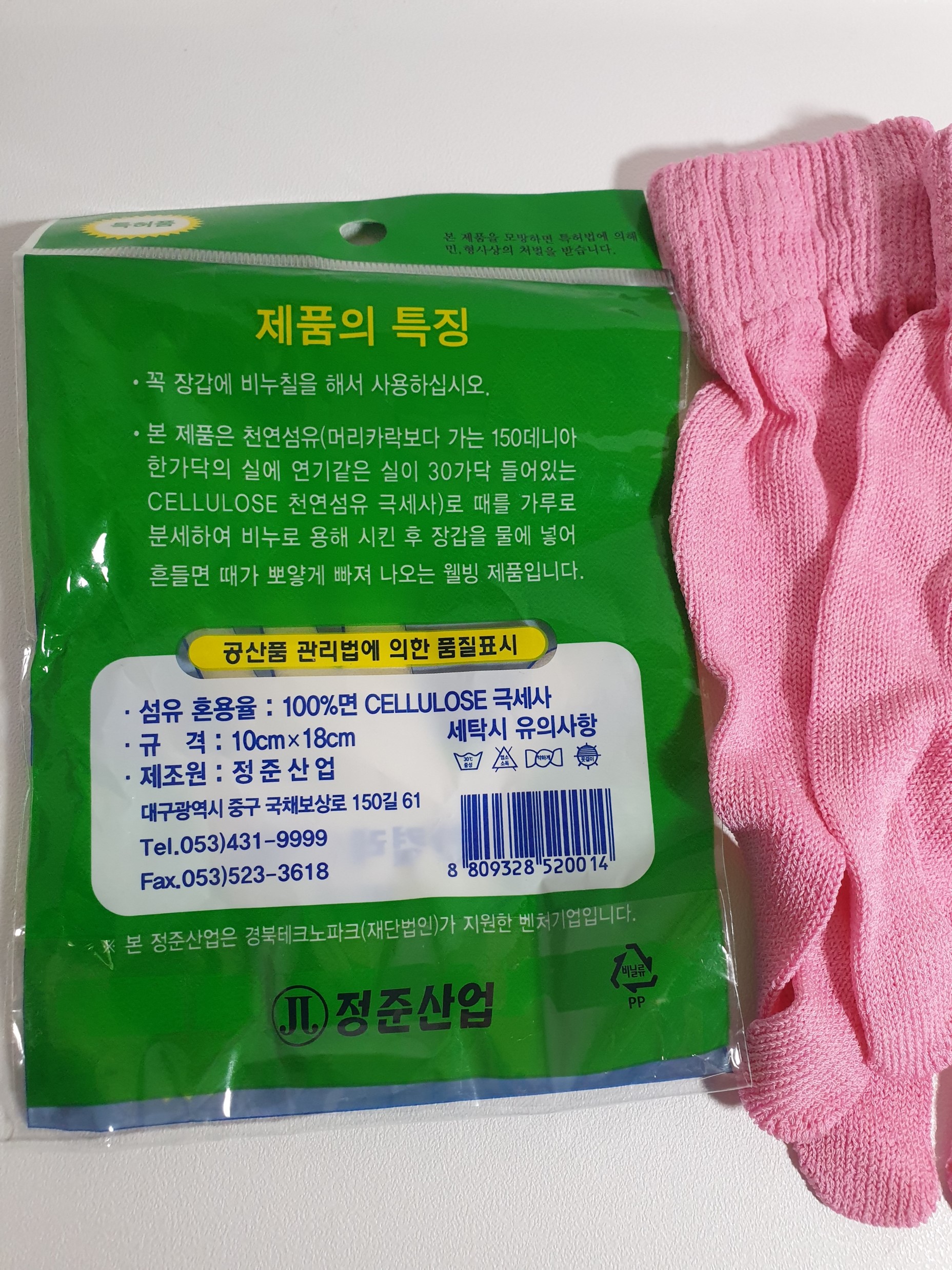 정준산업 요술 때밀이 장갑은 100% 면 CELLULOSE 극세사로 만들어졌고 국산이다.