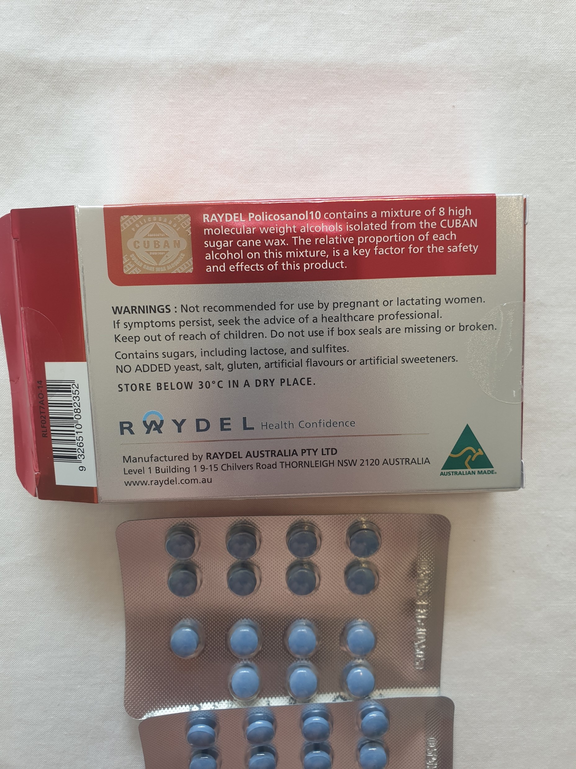 설명서는 들어있지 않았고 상자에 성분, 효능이 적혀있다. 레이델 폴리코사놀의 원료는 쿠바 폴리코사놀사탕수수왁스알코올인데 폴리코사놀은 원산지가 쿠바인게 좋다고 한다.