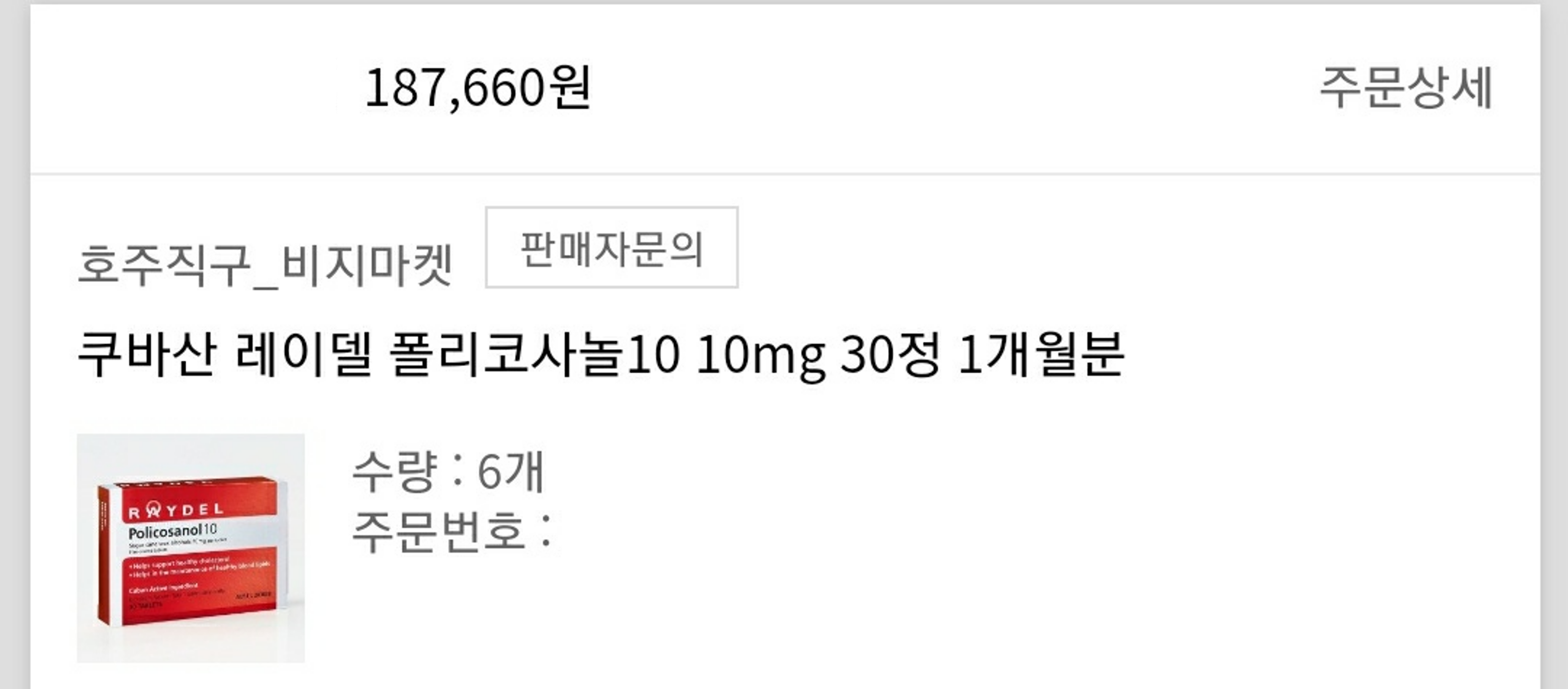 옥션에서 호주직구 비지마켓에서 판매하는 쿠바산 레이델 폴리코사놀 10 10mg 30정 1개월분 6개를 구매했고 가격은 배송비를 포함해서 187,660원이었다. 1개월분에 31,276원, 1알에 1,042원이었다.