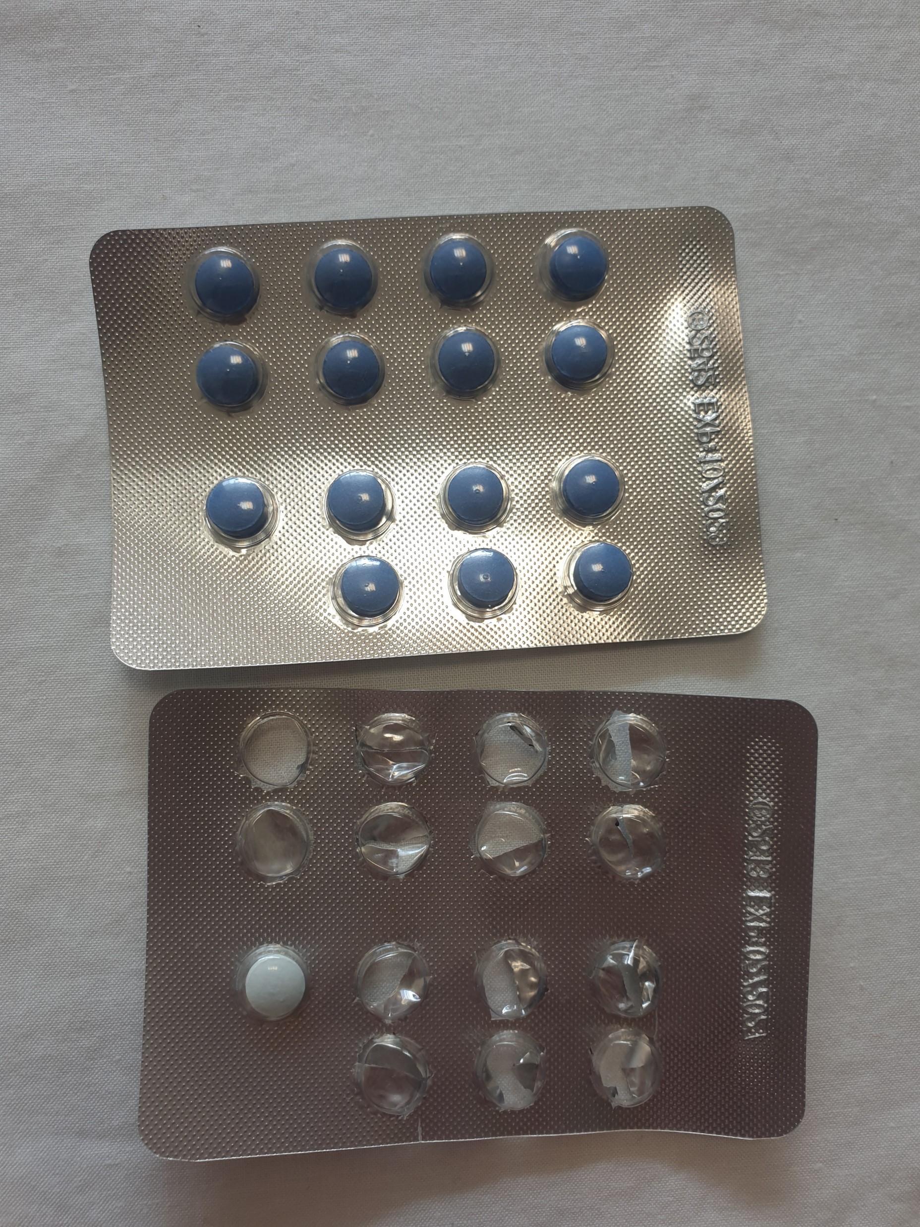 레이델 폴리코사놀 10 상자를 열면 파란색 원형 알약이 30개 들어있다.