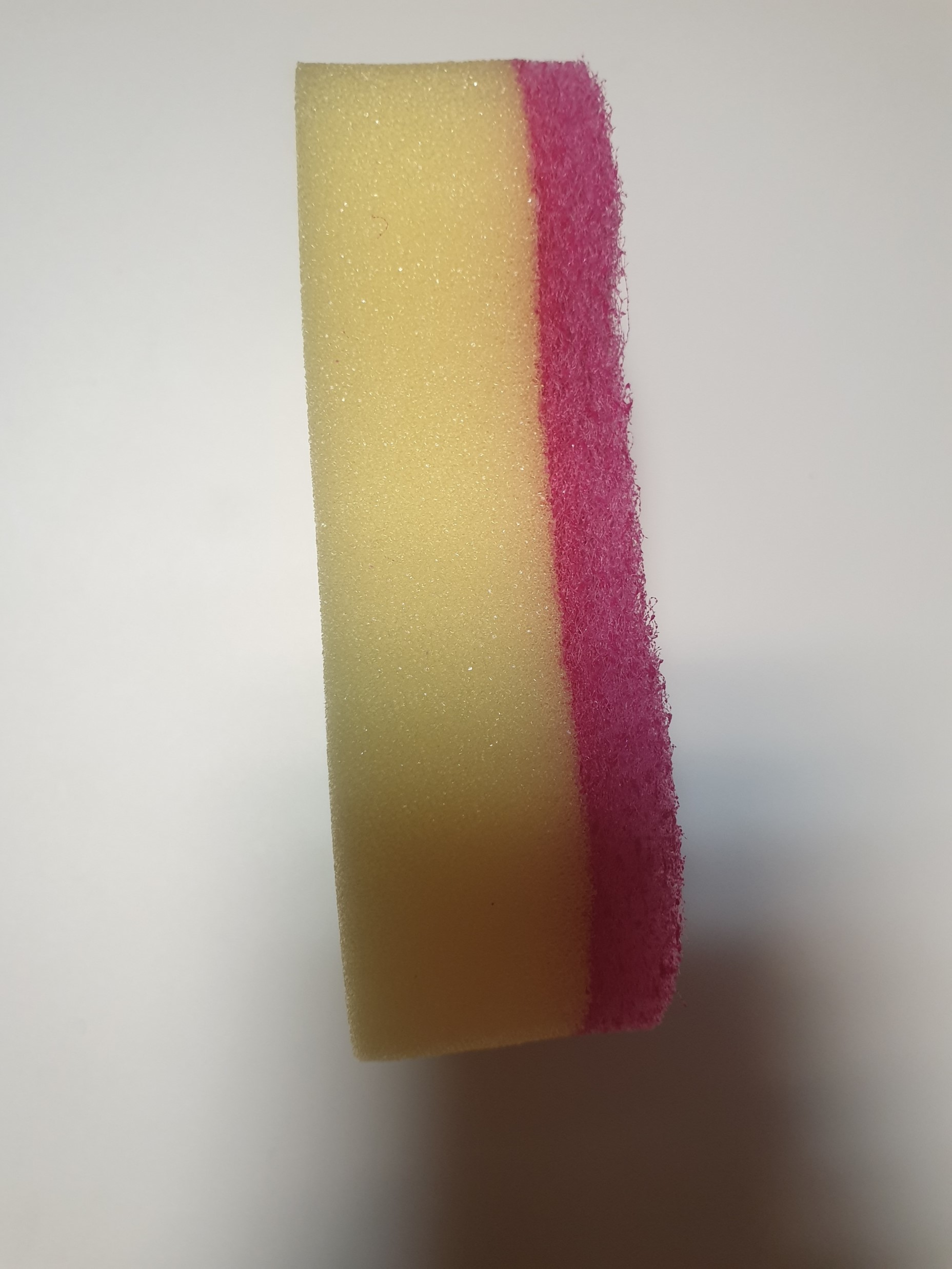 핑크색으로 골랐고 한 쪽면은 노란 스펀지이고 다른 면은 분홍색 수세미이다.