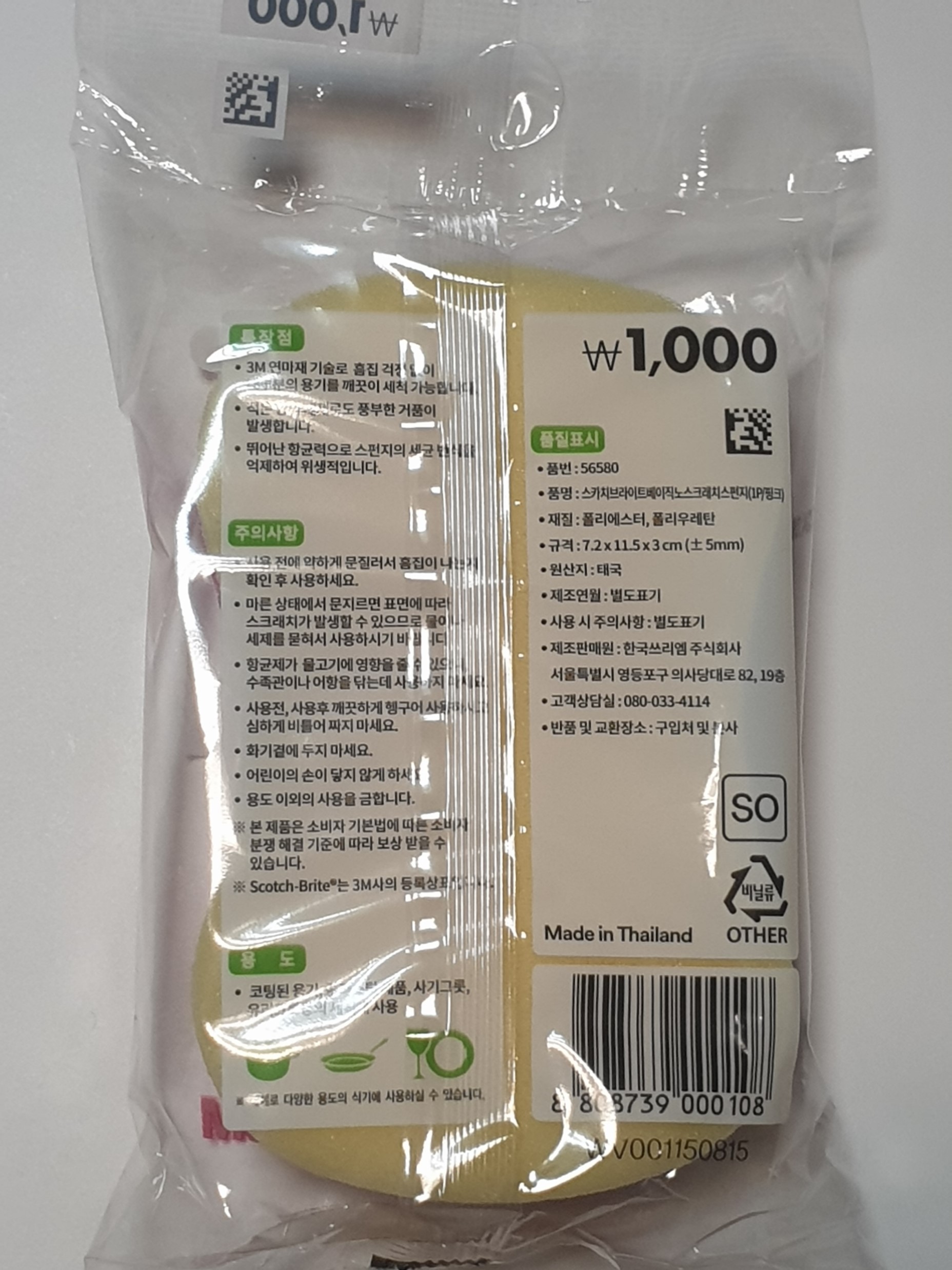 다이소 스펀지 수세미 품번은 56580이고 품명은 스카치브라이트베이직스크래치스펀지이고 원산지는 태국, 사이즈는 7.2*11.5*3cm이다. 다이소 스펀지 위치는 주방용품 코너에 있었고 가격은 1,000원이었다.