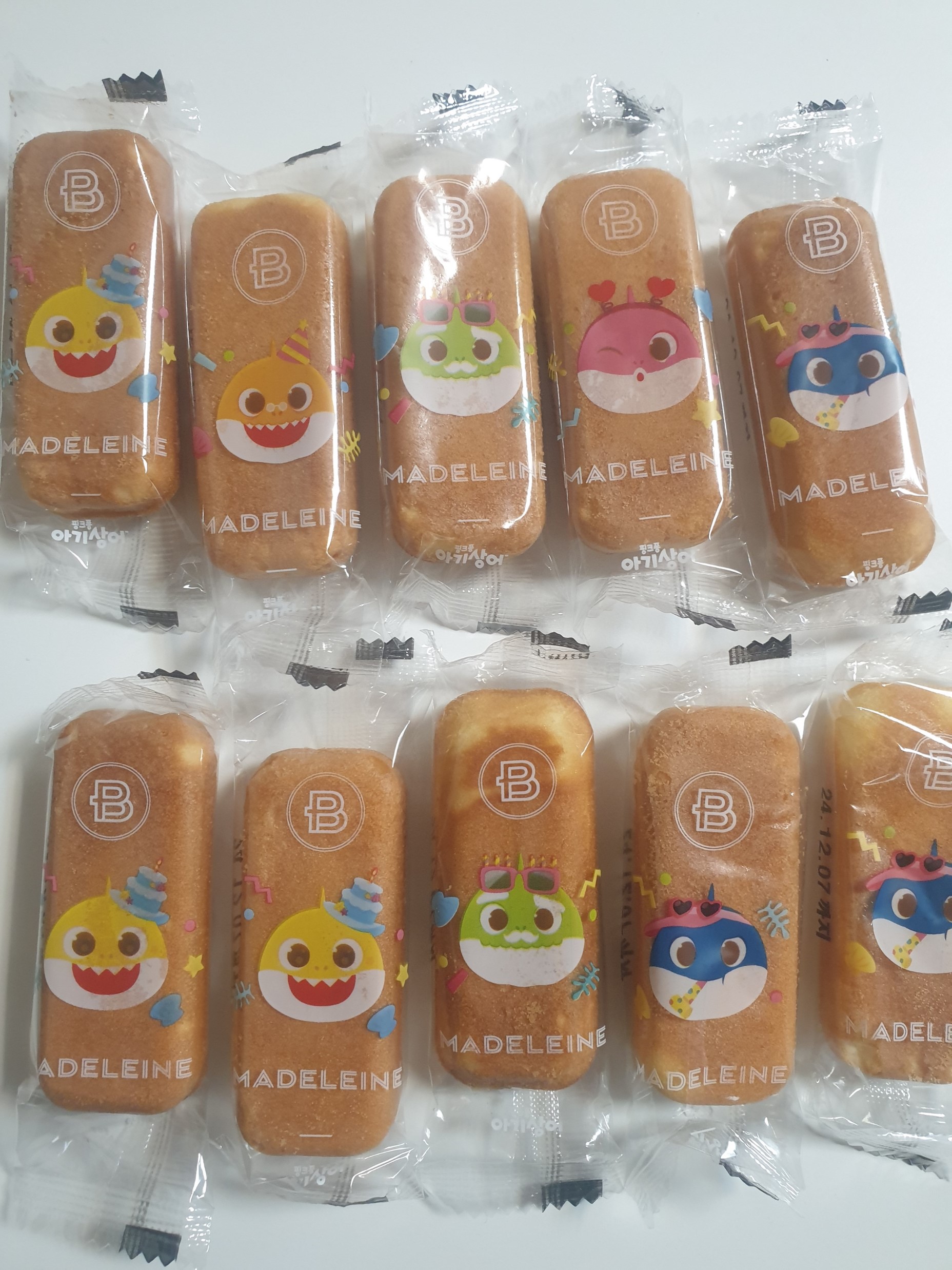 우리아이 앙팡 마들렌은 핑크퐁 아기상어와 협업한 상품으로 포장지에 상어가족이 그려져 있다.