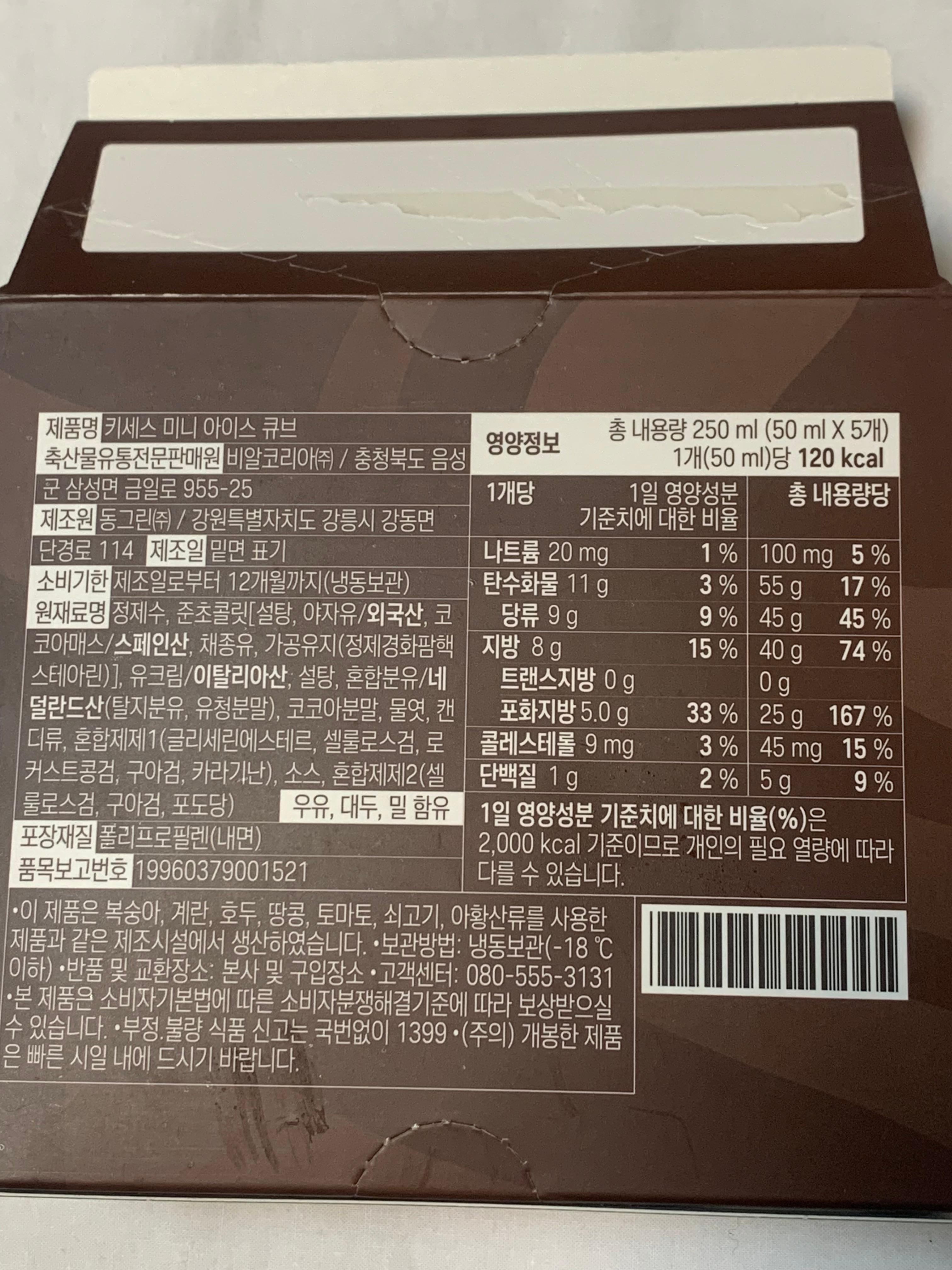 키세스 미니 아이스큐브 칼로리는 1개(50ml)에 120kcal.