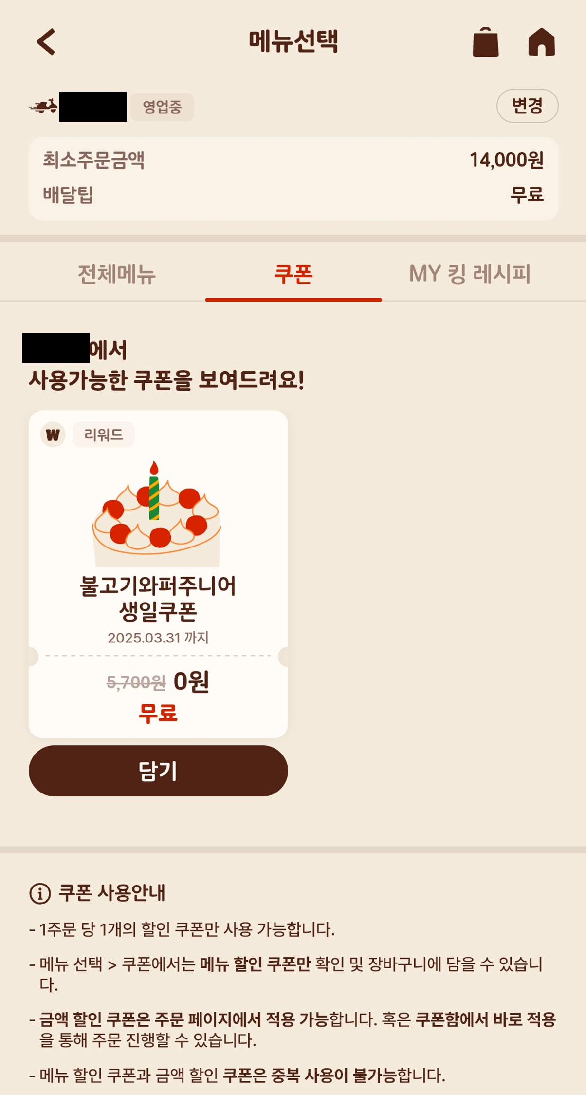 버거킹 배달 쿠폰은 리워드 쿠폰만 사용할 수 있었는데 불고기와퍼주니어 생일쿠폰은 리워드 쿠폰이라 배달에서도 사용할 수 있었다.