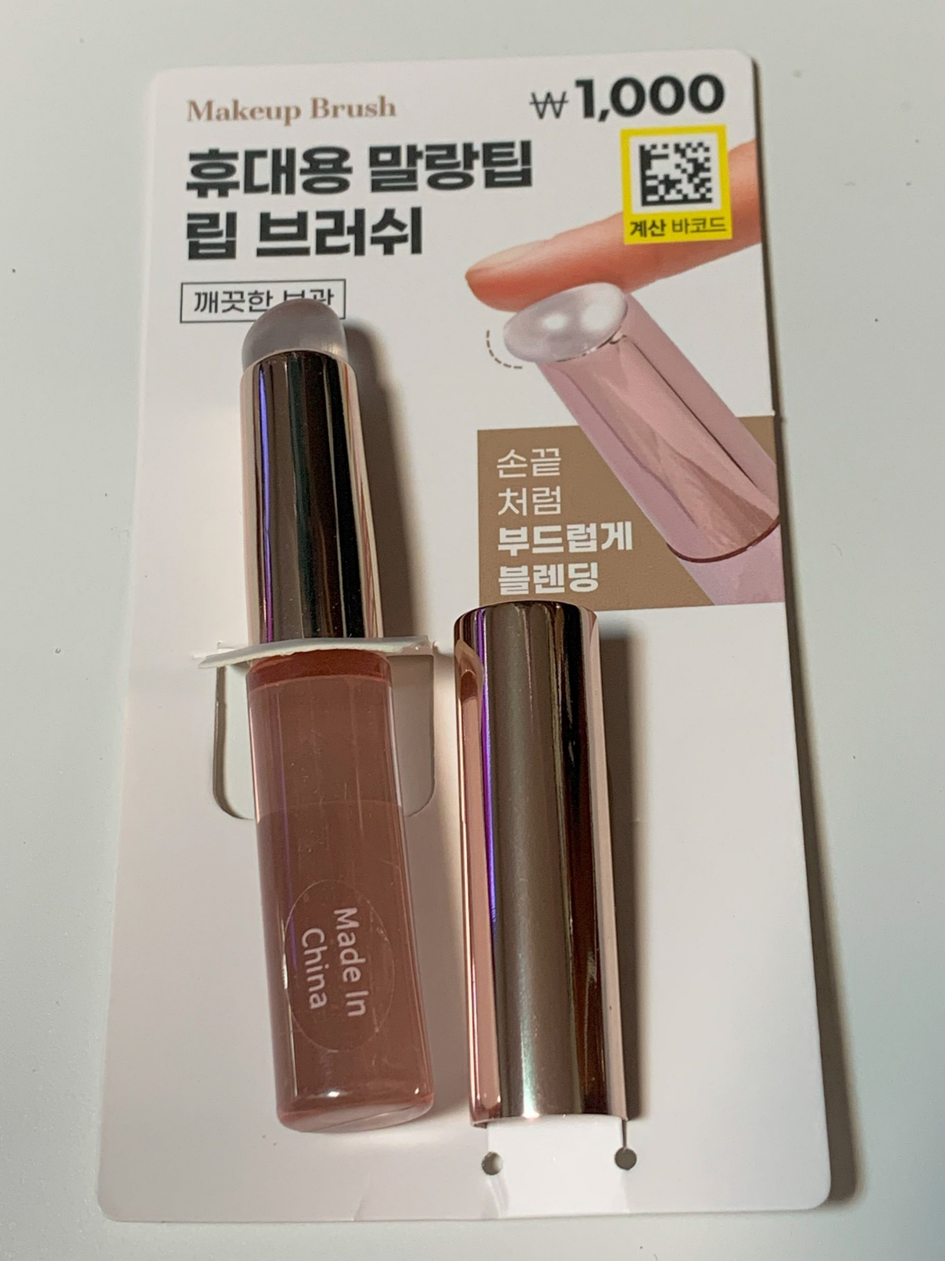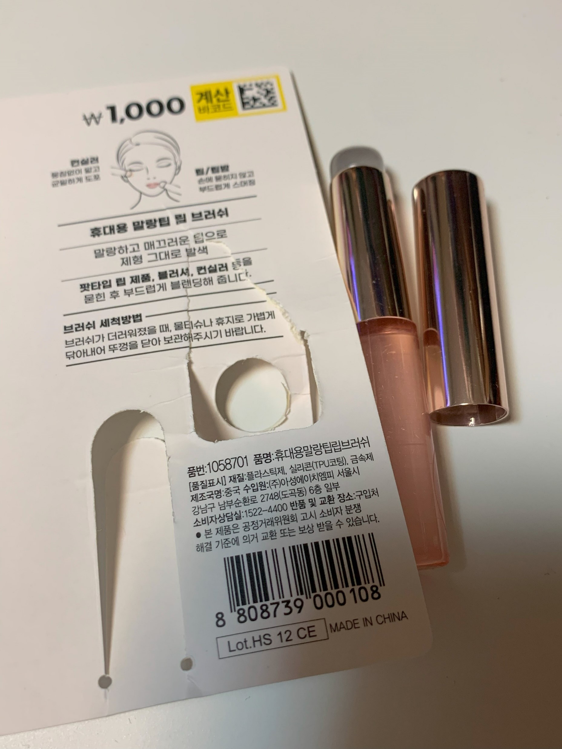 다이소 휴대용 말랑팁 립브러쉬 가격은 1,000원이었고 품번은 1058701, 원산지는 중국이었다.