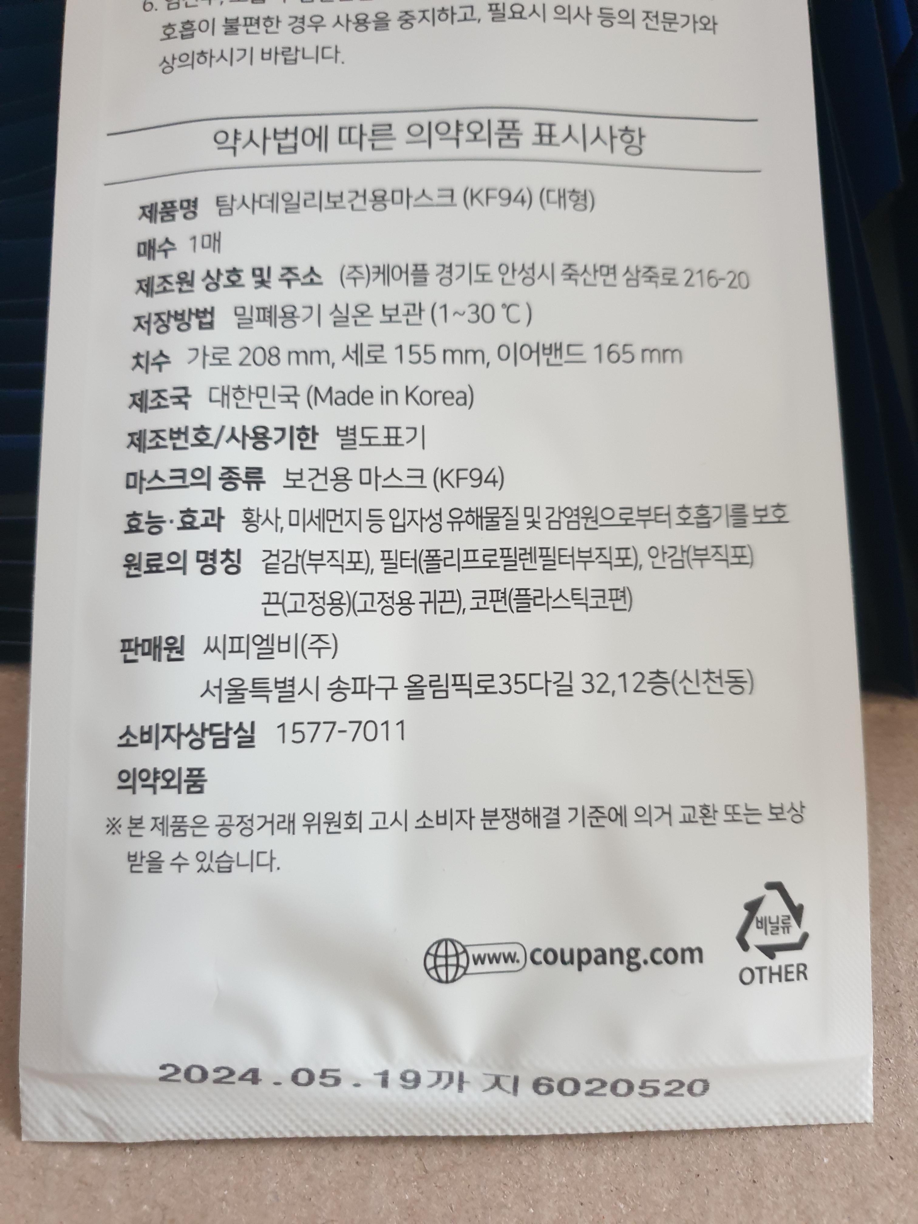 그러다가 이제 마스크가 얼마 안 남고 싫어하는 마스크만 남아서 쿠팡에서 kf94 마스크를 샀다.